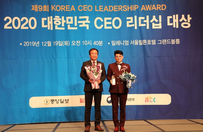 | ▲ 최철홍 보람그룹 회장(오른쪽)이 19일 서울 밀레니엄 힐튼에서 열린 ‘2020 대한민국 CEO 리더십 대상’ 시상식에서 고객중심나눔경영 부문 대상을 2년 연속 수상했다.(사진제공=보람상조) |