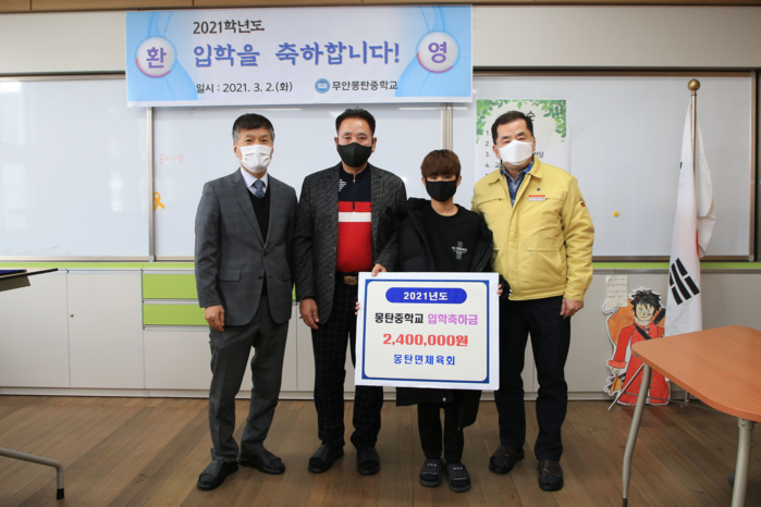 체육회는 학생이 감소하고 있는 지역 학교에 활력을 불어넣고자 몽탄초등학교 입학생 5명에 1인당 30만원, 몽탄중학교 입학생 12명에게 1인당 20만원을 지원했다.
