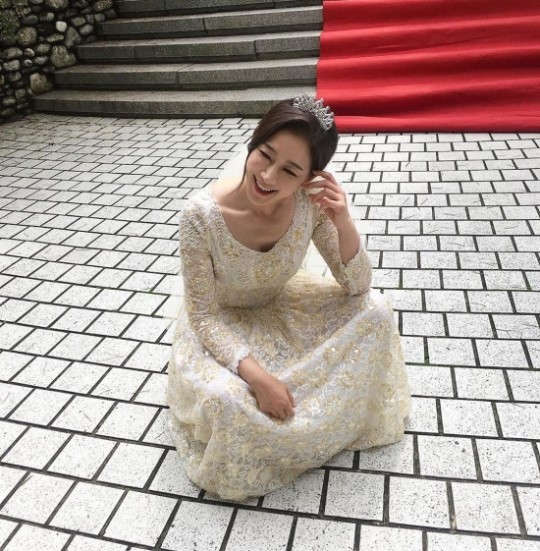 공개된 사진 속 김하영은 웨딩드레스를 입은 채 쪼그려 앉아 있는 모습. 그녀는 "#프로시집러 #연쇄혼인마 #시집의 달인"이란 해시태그를 달았다.