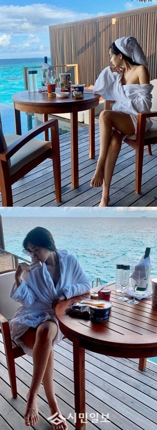 사진에는 신재은이 바다를 배경으로 하얀색 샤워 가운만 걸친 채 의자에 앉아있는 모습이 담겨 남심을 사로잡았다.