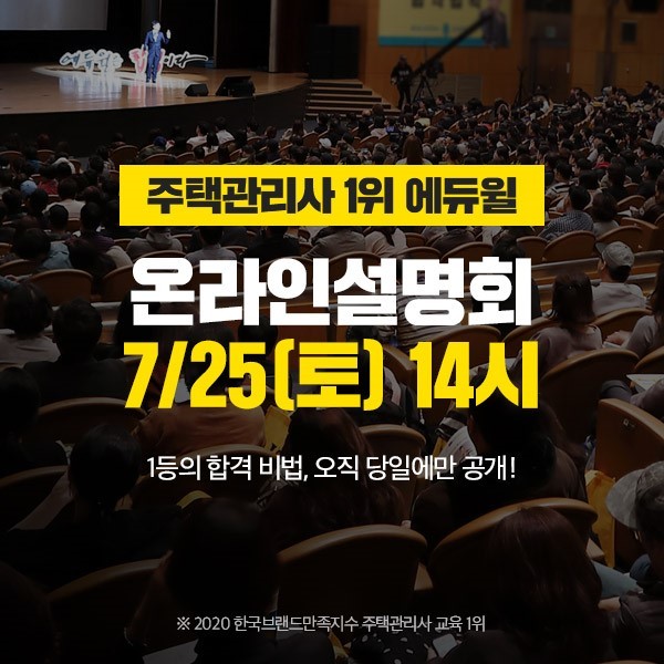 [시민일보 = 여영준 기자] 종합교육기업 에듀윌(대표 박명규)이 오는 25일 오후 2시부터 공식 유튜브 채널을 통해 ‘2020 주택관리사 온라인 설명회’를 개최한다.