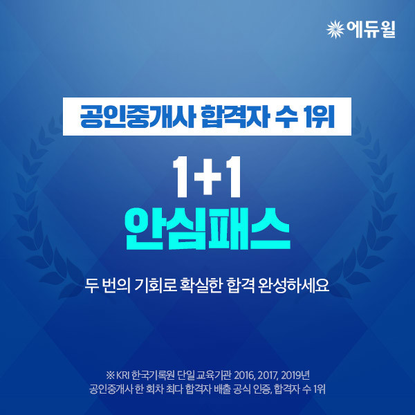 [시민일보 = 여영준 기자] 종합교육기업 에듀윌(대표 박명규)은 수강료 부담 없이 2년간 공인중개사 시험을 준비할 수 있는 '공인중개사 1+1 안심패스'를 마련했다고 밝혔다.
