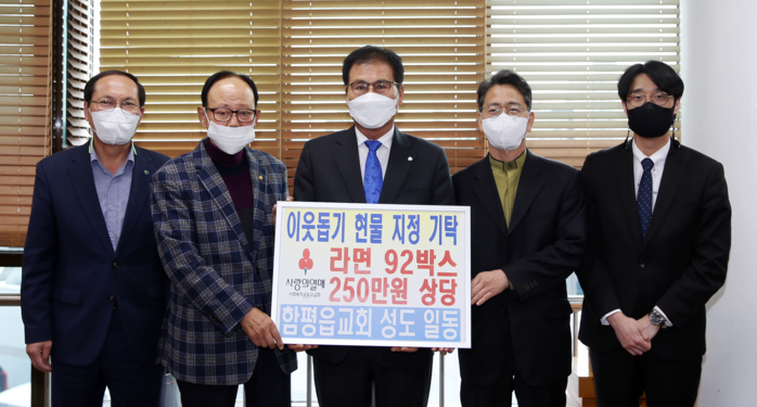 [시민일보 = 황승순 기자] 함평군은 지난 23일 함평읍교회(목사 박광석)에서 지역소외계층에 전달해 달라면 250만 원 상당의 라면 92박스를 기부했다고 24일 밝혔다.