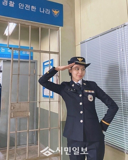 공개된 사진 속 수영은 경찰복을 입고 거수 경례를 하는 모습을 드러내 시선을 사로잡았다.