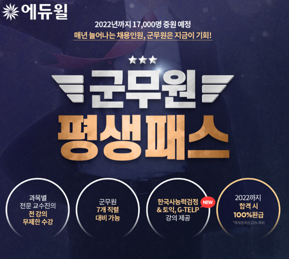 2022년까지 군무원 시험에 합격할 경우 제세공과금을 제외한 수강료를 모두 환급해주고, 시험에 불합격시 다음 시험일까지 수강기간을 연장해주는 혜택도 담고 있다.