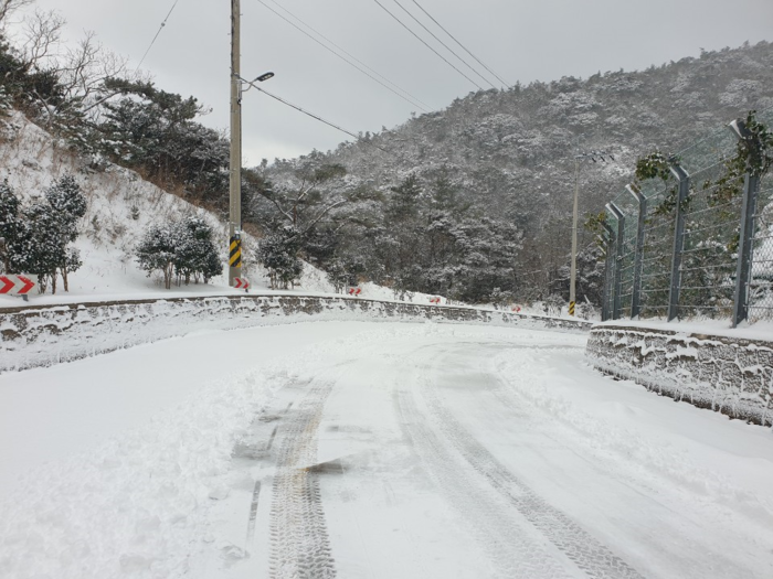 | 폭설과 한파로 흑산도 도로가 눈으로 가득 쌓인 모습(출처=흑산면사무소) |