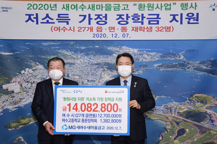 여서동 새여수새마을금고는 ‘환원사업 지원의 날’을 통해 관내 저소득 아동‧청소년의 꿈과 희망을 지원하고자 지난 7일 장학금 14,082,800원을 마련해 여수시에 전달했다.