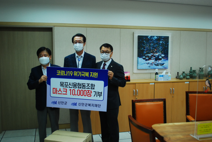 목포신협 박우영 이사장은 지난 23일 신안군청을 방문 신안복지재단 이사장인 박우량 군수에게 덴탈마스크 1만장을 기증했다. 사진은 박 군수(가운데) 및 박 이사장(오른쪽)이 기념촬영을 하고 있는 모습.(사진제공=목포신용협동조합)