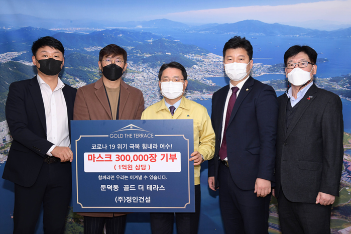 ㈜정인건설(대표 차성환, 성명준)이 지난 7일 여수시청을 찾아 코로나19 위기 극복을 위해 1억 원 상당의 덴탈마스크 30만 매 기증서를 여수시에 전달했다.