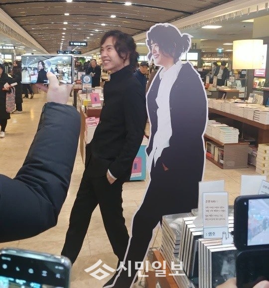 사진 속 양준일은 자신의 판넬과 똑같은 포즈를 하며 환하게 웃고 있는 모습으로 팬심을 사로잡았다.