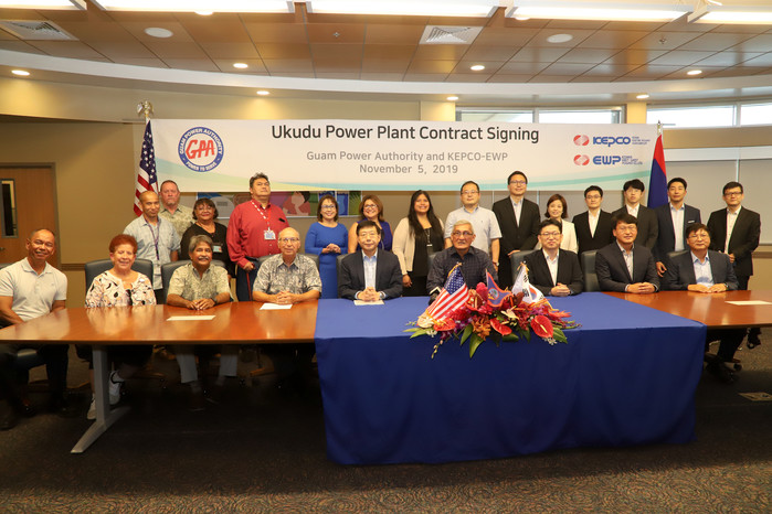 | ▲ 괌 우쿠두 가스복합발전 프로젝트 전력판매계약 체결 후 기념촬영 모습.(사진제공=한전) |