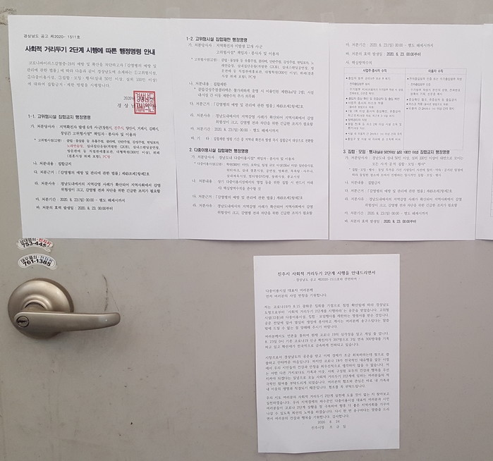 조규일 진주시장은 지난 23일 사회적 거리두기 2단계 시행과 관련하여 다중이용시설 대표자들에게 ????다중이용시설 집합금지 및 제한 명령서????와 함께 적극 동참을 호소하는 서한문을 전달했다.