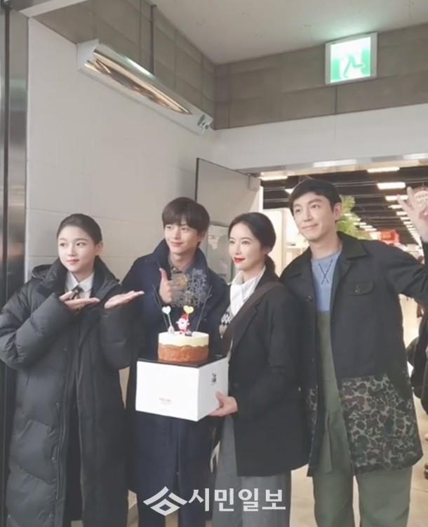 사진 속 황정음은 함께 출연하는 배우들과 함께 케이크를 들고 사진 촬영 중으로 훈훈함을 자아냈다.