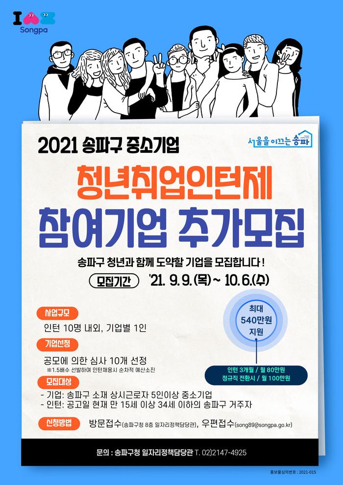 청년인턴은 만 15세 이상 34세 이하의 송파구 거주 미취업 청년이 대상이다. 송파구 거주 청년을 채용한 기업을 우선 지원하나, 미달 시 서울시 거주 청년 선발 기업도 지원할 예정이다. 인턴기간 3개월은 매월 80만 원이 지원되며, 기업이 청년인턴을 정규직으로 전환할 경우 추가 3개월 동안 매월 100만 원을 지원한다.
