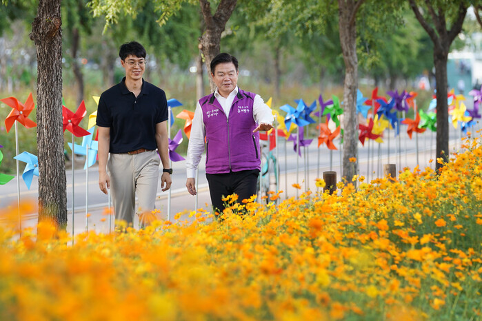 | ▲ 이필형 동대문구청장(오른쪽)이 중랑천 둔치 장평교 일대에 만개한 황화 코스모스를 보고 있다. |