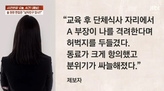 이와 관련해 온라인 커뮤니티를 중심으로 술자리 면접의 제보자의 발언이 논란을 빚으며 큰 주목을 받고 있다.
