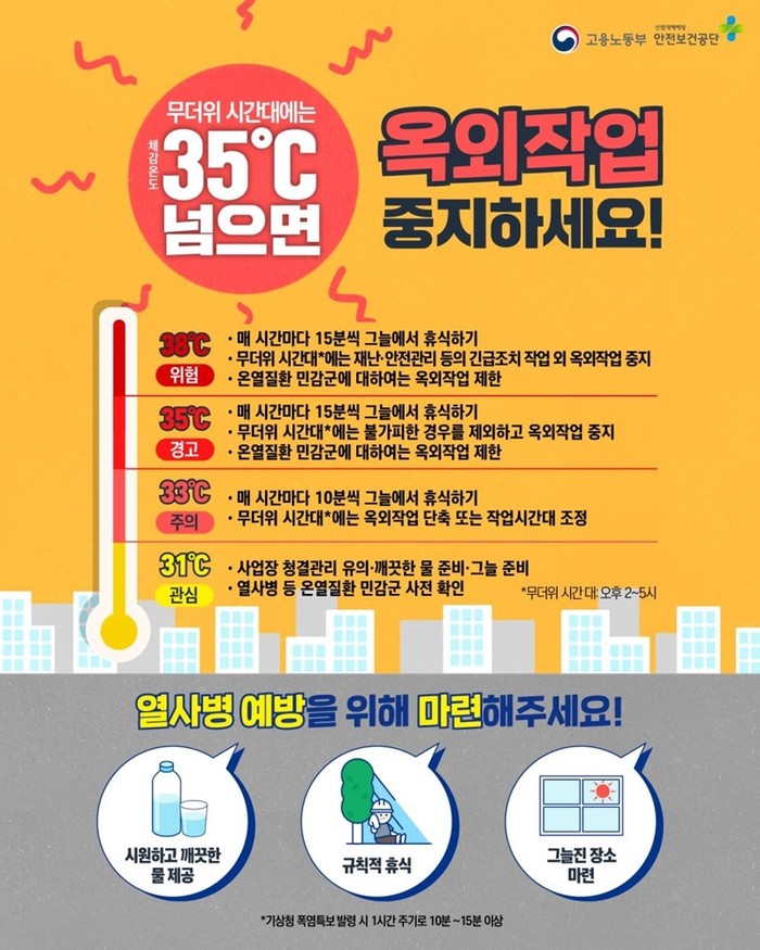 무더위 시간대(14:00~17:00)는 실외 작업을 피하고, 폭염특보 발령 시 1시간 주기로 15분 이상 규칙적으로 휴식을 취하는 조치사항을 군 사업장은 물론 50인 이상 민간사업장에도 안내했다.