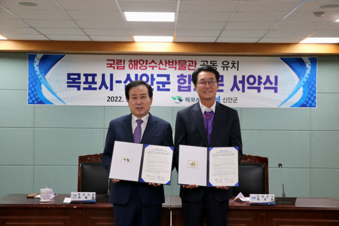 [신안=황승순 기자] 신안군(군수 박우량)과 목포시(시장 박홍률)는 29일 목포시청에서‘국립 해양수산박물관 공동 유치를 위한 합의문 서약식’을 가졌다.