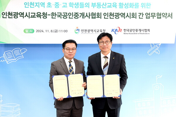 [인천=김형만 기자] 인천시교육청은 11월 8일 한국공인중개사협회 인천광역시회와 업무 협약을 체결하고, 인천 초·중·고 학생들의 전세 사고 예방을 위한 실무 중심의 부동산 교육을 강화한다고 밝혔다.
