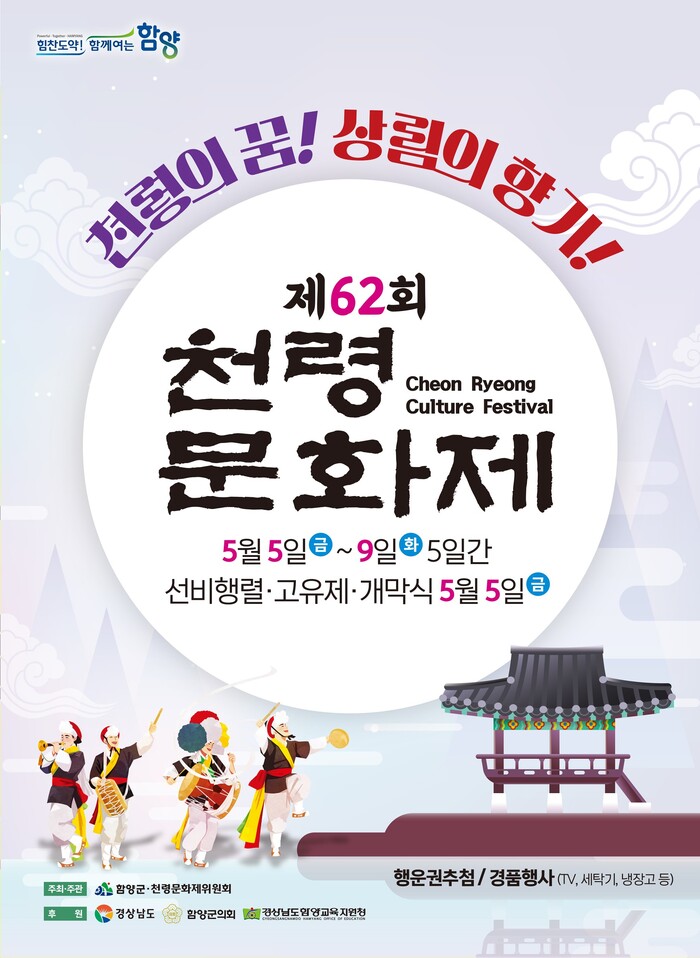 제62회 천령문화제는 “천령의 꿈, 상림의 향기”라는 주제로 첫째날인 5일에는 천령문화제의 화려한 서막을 알리는 선비행렬을 비롯해 고유제, 어린이날 행사, 시낭송, 비보이 및 마술공연, 개막식, 축하공연(진성, 한혜진, 송도현, 빈예서, 최현상 등 출연) 등을 통해 5일간의 일정에 돌입한다