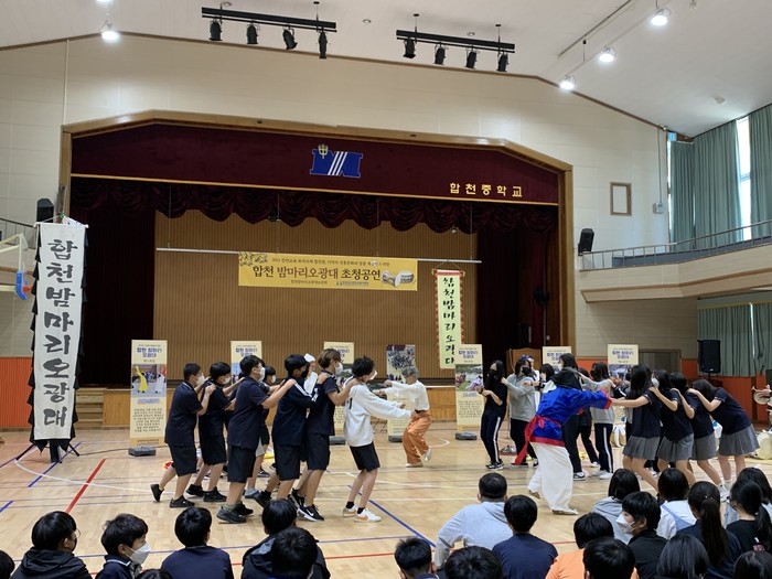 합천밤마리오광대 초청 공연은 합천교육지원청 특색과제인 ‘지역연계 교육과정 운영으로 내고장 인재기르기’ 의 일환으로 지역의 전통문화와 얼을 계승하기 위해 합천밤마리오광대 보존회의 도움을 받아 실시하는 활동이다.
