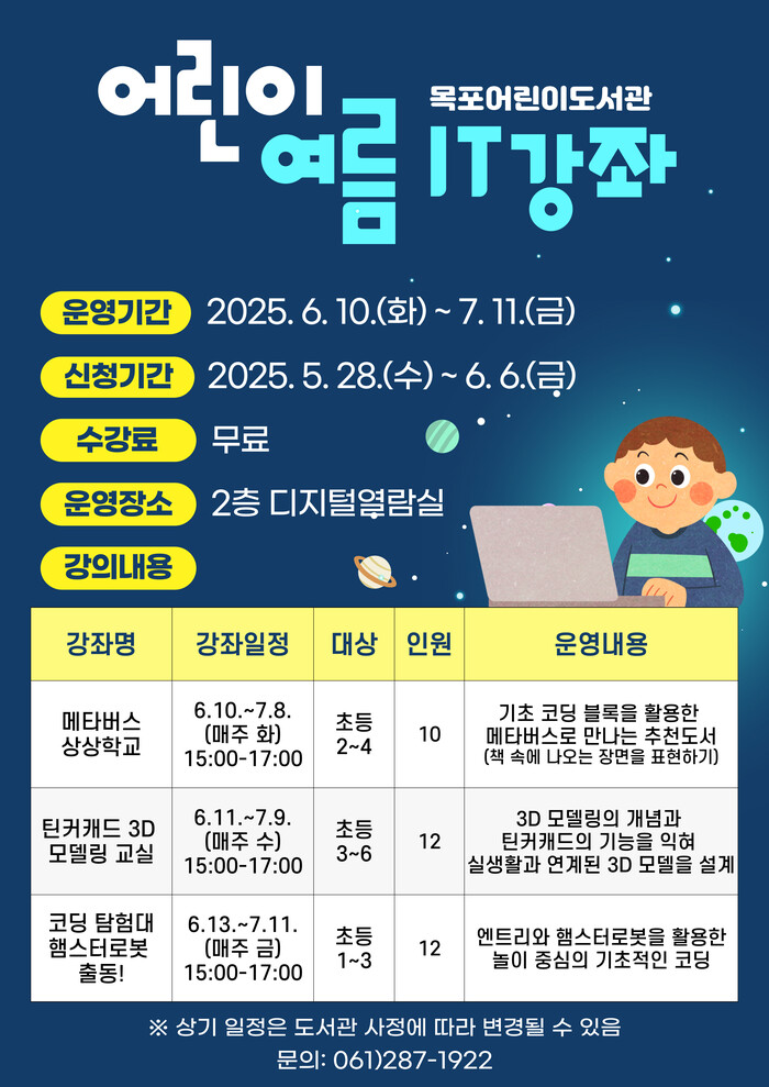 [목포=황승순 기자]목포어린이도서관(관장 최진수)은 어린이들의 문제 해결력과 창의력 향상을 위해 오는 6월 10일부터 ‘2025년 여름 IT강좌’를 실시한다.