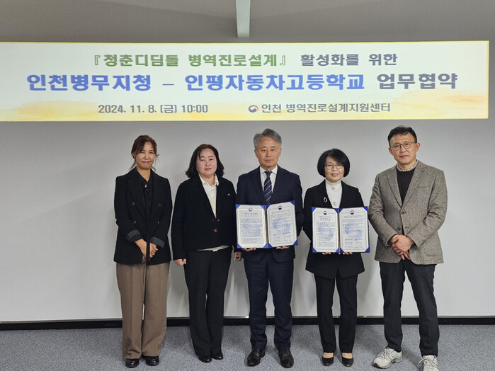 [인천=김형만 기자] 인천병무지청11월 8일, 인천 병역진로설계지원센터에서 인평자동차고등학교(교장 이재란)와 ‘청춘디딤돌, 병역진로설계’ 활성화를 위한 업무협약을 체결했다.