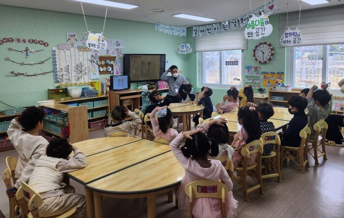 | ▲ 보성군, 사후 장애 방지 ‘후천적 손상 예방 교육’ 실시_동화나라어린이집에서 원아를 대상으로 국립 재활원 소속 장애인강사가 아이들 눈높이에 맞춰 교육하고 있다(출처=보성군) |