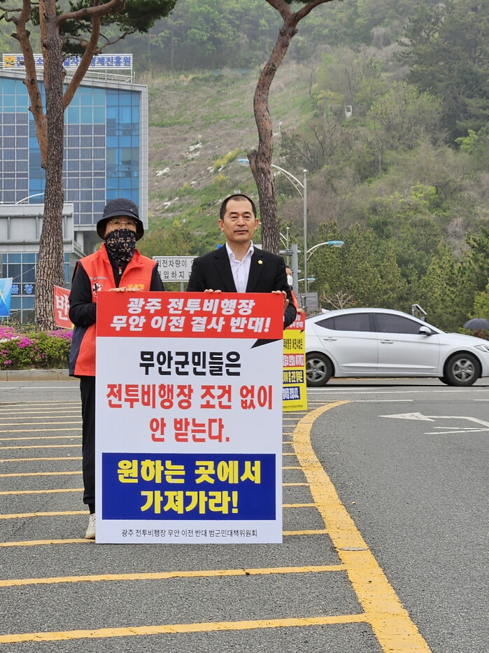 이날 시위는 삼향읍번영회와 범대위 주관으로 7시부터 진행했으며 이호성 군 의회 군 공항 이전 반대 특별위원장(특위위원장), 임동현 부의장 등이 참여했다.