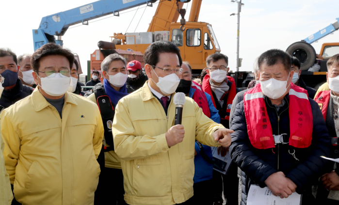 | ▲ 김영록 전남도지사, 해남 김 황페화 피해 현장 찾아 어민들을 위로(출처=전남도청) |