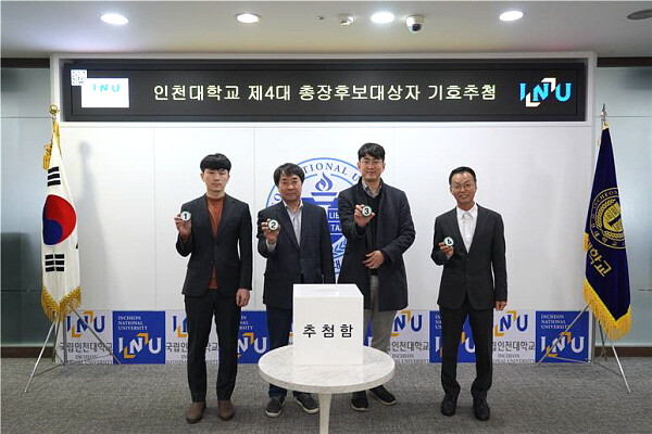 이날 추첨에 따라 기호 1번 최병길(인천대 도시환경공학부 교수), 기호 2번 강현철(인천대학교 명예교수), 기호 3번 이인재(인천대 경제학과 교수), 기호 4번 임경환(인천대 생명과학부 교수) 순으로 결정됐다.