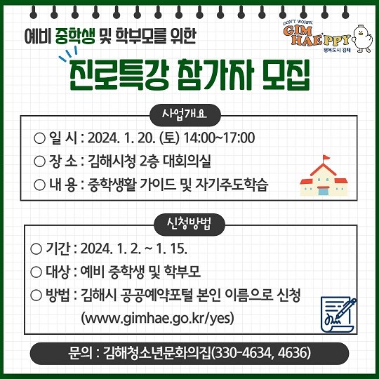 관내 예비 중학생 및 학부모는 누구나 참여 가능하고, 사전 신청은 1월 2일부터 김해시 공공예약포털 로 본인 이름으로 신청하면 된다.