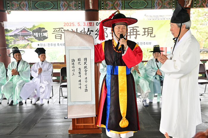 성균관유도회 진주지부(회장 정종성)는 지난 3일 진주시 촉석루에서 지역 유림과 방문객 등 300여 명이 참석한 가운데 조선시대 과거제도를 재현한 ‘제11회 진주목 향시’재현 행사를 성황리에 개최했다.
