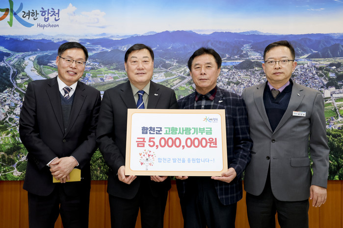 김윤철 합천군수는 “합천 발전을 위해 대한 남다른 애정을 보여주신 데에 깊이 감사드린다”며 “기부해 주시는 고향사랑기부금은 지역 발전 등에 소중하게 사용되는 만큼 출향인들의 많은 참여를 부탁드린다”고 말했다.