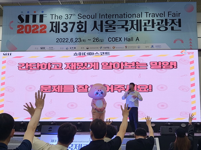 특히, 전문MC와 굿바비가 함께 진행한 ‘밀양 관광 퀴즈 게임’에서는 밀양의 대표 관광지 영남루, 얼음골과 오는 9월 22일 개최되는 밀양아리랑대축제 등 밀양과 관련된 다양한 퀴즈 정답을 맞히는 관람객에게 굿바비 굿즈를 상품으로 건네 큰 인기를 끌었다.