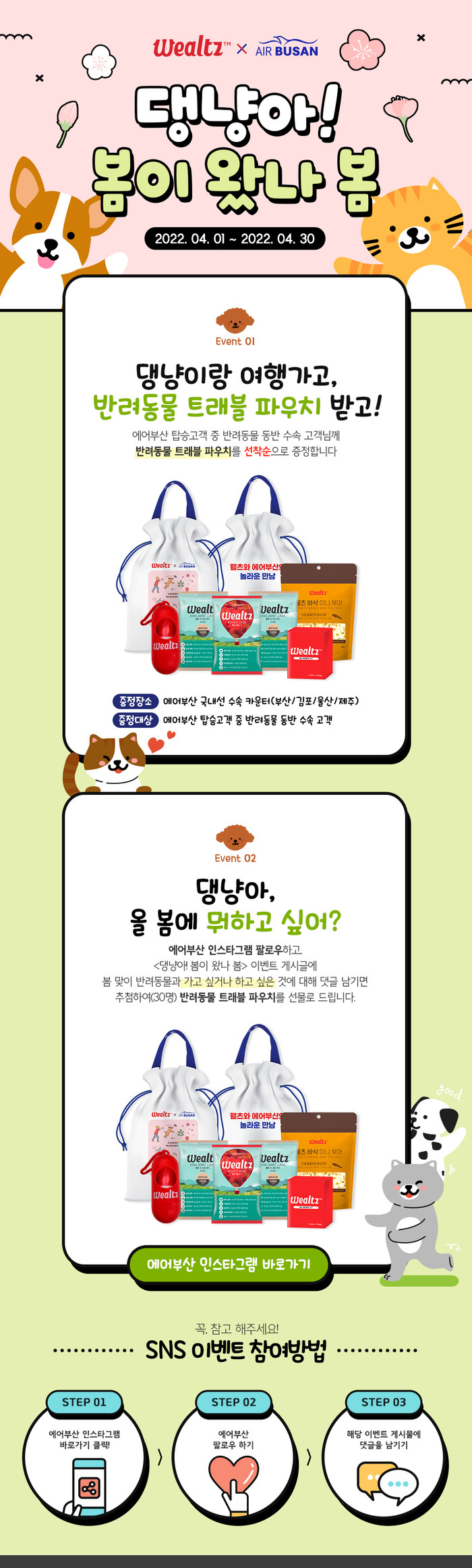 에어부산 관계자는 “반려동물 가구 수가 늘어남에 따라 동반 여행에 대한 관심도 커지고 있다는 점을 고려해 반려동물 관련 마케팅을 지속적으로 펼치고 있다.”라며 “이번 이벤트 기간 동안 에어부산을 이용해 반려동물과 봄 여행을 떠나 소중한 추억도 쌓고 트래블 파우치도 받으시길 추천드린다.”라고 전했다.