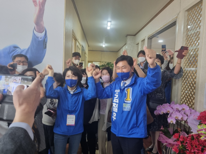 | ▲ 김철우 예비후보가 민주당 후보로 확정된 후 지지자들과 환호 하고 있다.(출처=김철우 예비후보 선거사무실). |