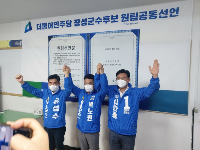 또한, 공천 결과 발표에 앞서 오전 9시 30분경 더불어민주당 장성지역위원회에서 세 후보가 만나 원팀 선언식을 진행했다.
