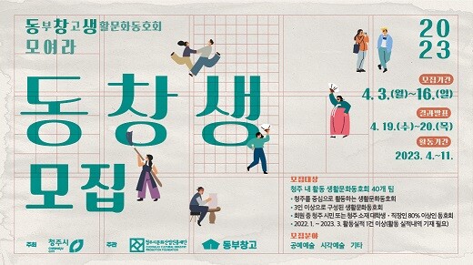 [청주=최성일 기자] 청주시 문화산업진흥재단(대표이사 변광섭, 이하 청주문화재단)은 오는 4월 16일까지 ‘2023 동‧창‧생 모여라!’와 함께할 생활문화동호회를 모집한다.