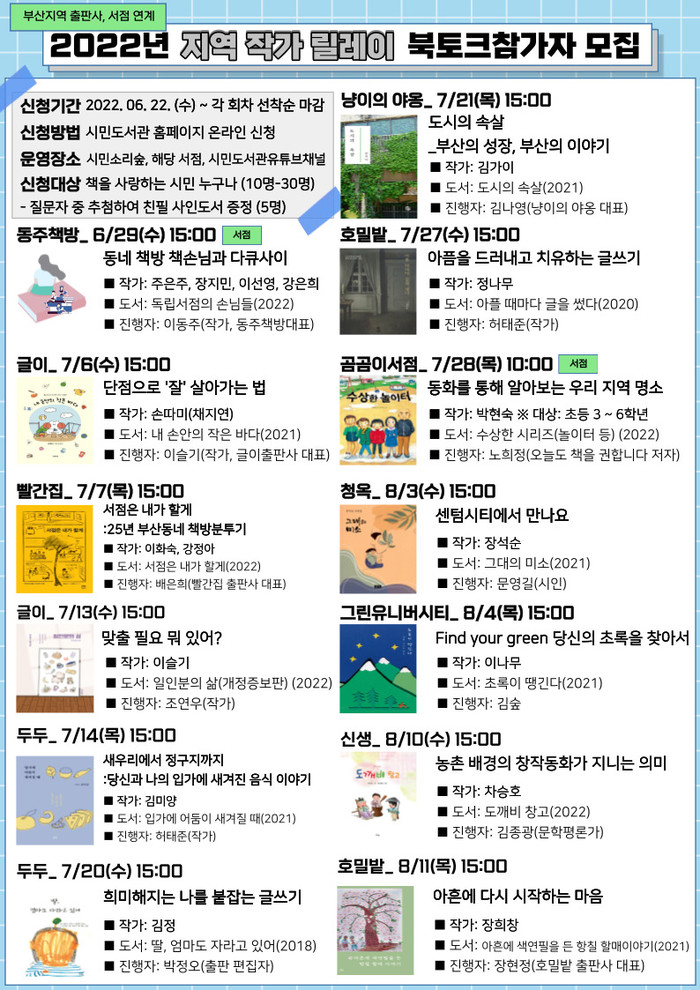 부산광역시립시민도서관(관장 김흥백)에서는 6월 29일부터 8월 11일까지 총 13회에 걸쳐 시민도서관 시민소리숲과 지역서점(동주책방, 곰곰이서점)에서 부산지역 시민을 대상으로 ‘2022년 지역작가 릴레이 북토크’ 행사를 연다.