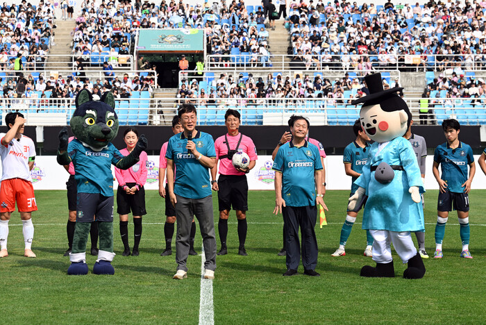 | 이민근 안산시장(앞줄 왼쪽 두번째)이 안산와~스타디움에서 진행된 ‘뭉쳐야 찬다4’ 첫 직관 경기에서 인사 발언을 하고 있다 /사진제공=안산시 |