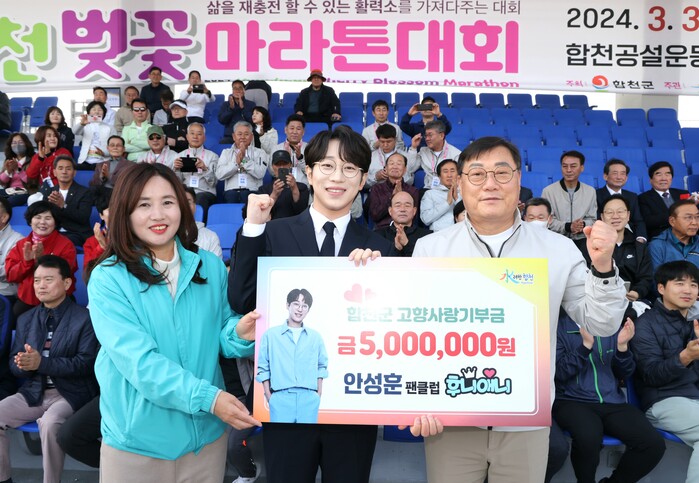 군은 벚꽃마라톤대회가 열린 합천공설운동장에서 미스터트롯 시즌2 진(眞)을 수상한 트로트 가수 안성훈씨를 홍보대사로 위촉했다. 안성훈 팬클럽 후니애니(회장 서연희) 회원들은 홍보대사 위촉을 기념해 팬클럽 회원들이 십시일반 모은 5백만원을 가수 안성훈의 고향 합천에 기탁하며 건전한 기부문화에 앞장서는 팬 문화를 보여줬다.