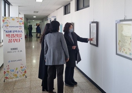 경상남도교육청(교육감 박종훈)은 지난 6일 ‘82세 문학소녀, 박경리를 꿈꾸다’라는 주제로 성인 문해 교실 졸업생 시화전을 열었다. 경남교육청 2층 갤러리에서 한 달 동안 열리는 이 전시회에는 도내 성인 문해 교실 졸업생들의 시화 30여 점과 학습자들의 작품으로 엮은 시집과 자서전이 전시됐다.