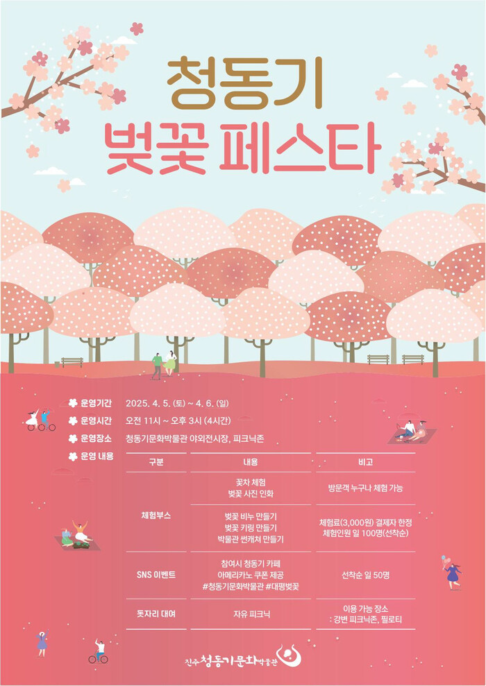 진주청동기문화박물관은 4월 5일과 6일 이틀간 벚꽃철 드라이브 코스로 사랑받고 있는 대평 벚꽃길과 연계한 문화 이벤트 ‘청동기 벚꽃 페스타’를 개최한다.