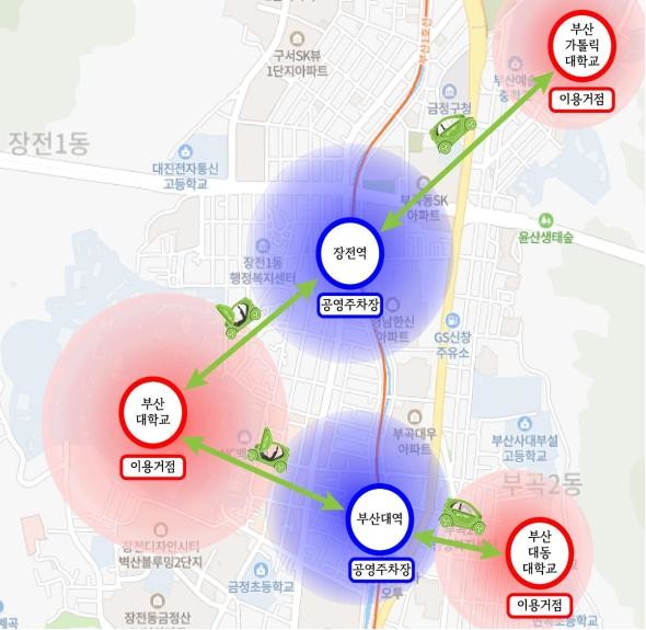 주요 내용은 공유모빌리티 운영 기업, 대학, 공공기관 등 유관기관과 협력체계 구축을 통한 주차.충전시설 등 기반시설 확충·정비, 대중교통 환승할인 추진 등이며, 사업 대상지역은 부산대역, 장전역 공영주차장 및 부산대학교, 부산가톨릭대학교, 대동대학교와 그 인근 지역이다.