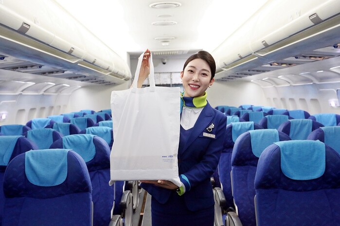 에어부산은 3일 부산과 인천에서 출발하는 방콕행 항공편에서 기내 면세품 구입 시 기존에 제공되는 일회용 비닐백 대신 재사용이 가능한 업사이클백에 담아 제공한다.