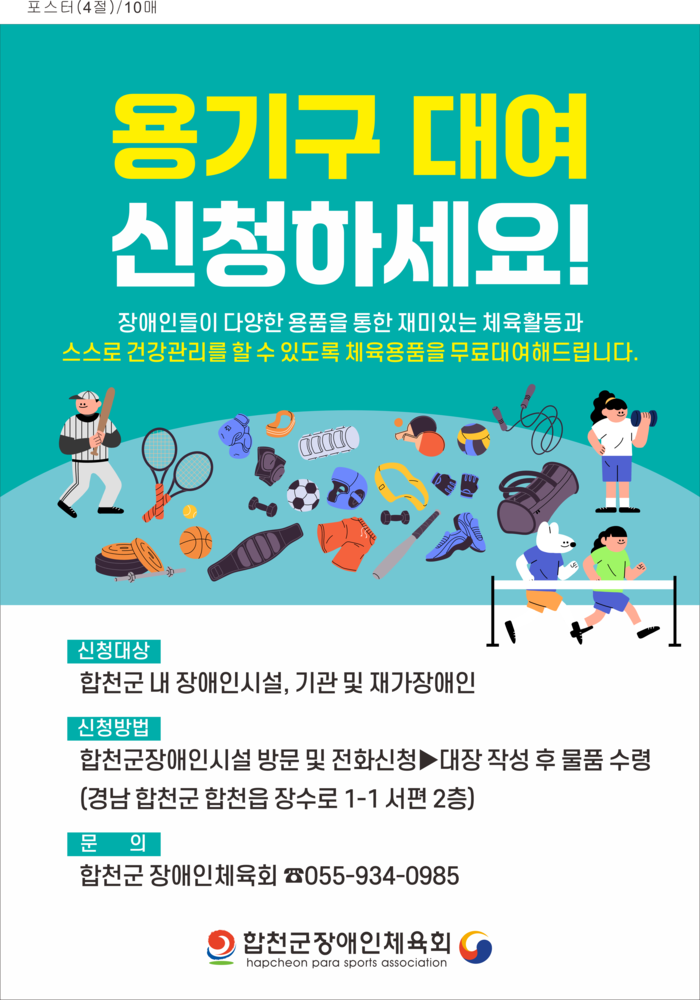 대여 신청 및 문의는 합천군장애인체육회 사무실(공설운동장 서편 2층)에 방문하거나 전화로 가능하며, 15일 간 대여 후 연장 또는 반납하면 된다.