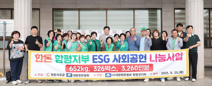 함평군은 28일 “(사)대한한돈협회 함평군지부(지부장 김상균)가 지난 25일 관내 취약계층을 위해 652㎏(3,260인분 상당)의 돼지고기를 기부했다”고 밝혔다.