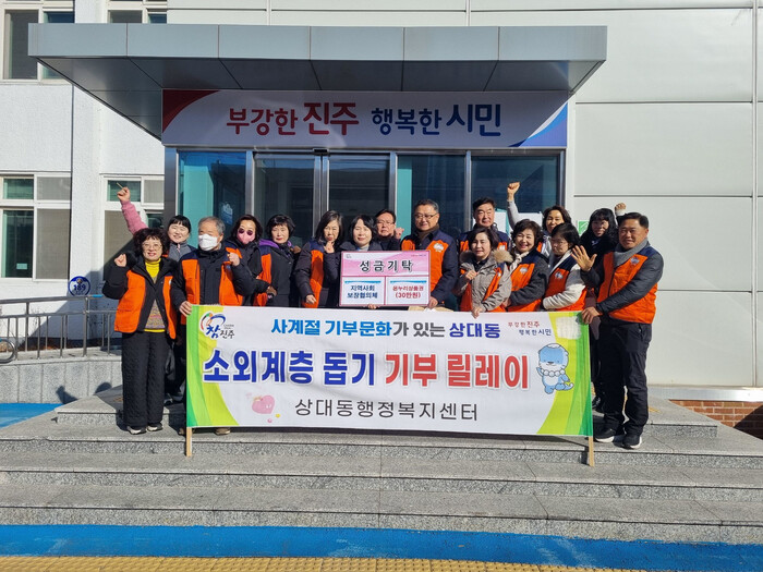 진주시 상대동은 2017년부터 상대동 봉사단체협의회(회장 하만명)와 함께 소외된 이웃을 돕기 위한 특수시책으로 기부 릴레이인 ‘사계절 기부문화가 있는 상대동’을 시행하고 있다.