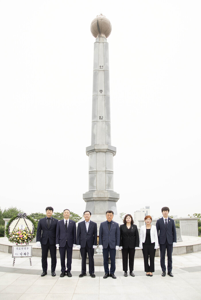 | ▲ 제9대 안산시의회 후반기 의장단, 11일 현충탑 참배 사진 왼쪽부터 최진호 의회운영위원장, 한명훈 기획행정위원장, 박태순 의장, 김재국 부의장, 박은정 도시환경위원장, 현옥순 의회운영부위원장, 설호영 문화복지위원장의 모습 /사진제공=안산시의회 |
